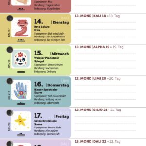 Mit dieser magischen Agenda im Taschenformat lernst du, dich mit der natürlichen, heiligen Zeit zu verbinden – so wie es die Maya vor langer Zeit schon taten. Sie hilft dir, deinen eigenen Rhythmus zu entdecken und spielerisch am grossen «ZEIT*SPIEL» teilzunehmen. Ob du 9, 14 oder 19 Jahre jung bist – oder einfach jung im Herzen – diese Agenda lädt dich ein, den Alltag mit anderen Augen zu sehen und dein Jahr bewusster zu gestalten.
